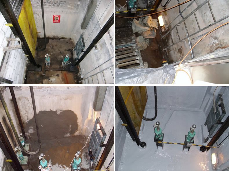1、鑿槽引排:鑿孔裝管,或者采用人工方式,將電梯井室內(nèi)的積水排出,漏出滲漏的混凝土表面。